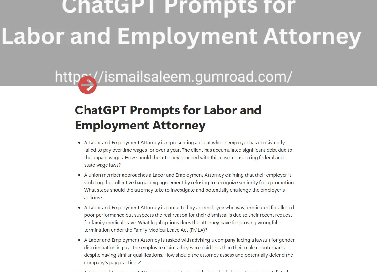 Enhance your labor and employment law practice with "ChatGPT Prompts for Labor and Employment Attorney"! This e-book is specifically designed to help labor and employment attorneys navigate the complexities of workplace law with efficiency and precision. Whether you're dealing with wrongful termination, discrimination claims, wage disputes, or employee benefits, this guide offers tailored prompts that simplify case preparation, improve client communication, and streamline document drafting. Save time, boost productivity, and ensure the best possible outcomes for your clients with this essential resource for labor and employment law professionals.
