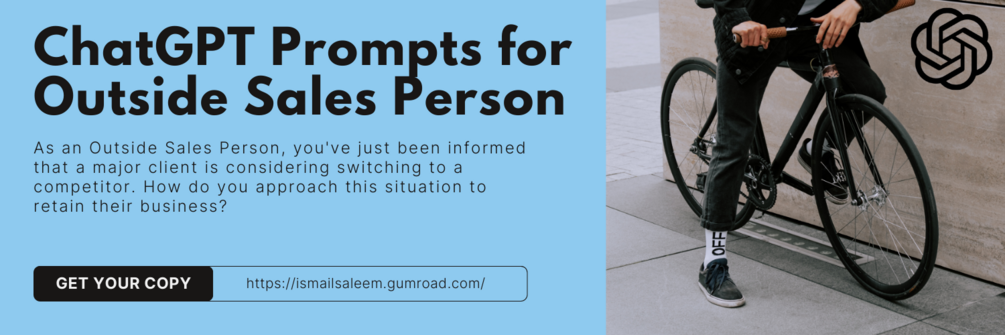 #ChatGPTPrompts #OutsideSales #SalesStrategy #LeadGeneration #ClientAcquisition #SalesNegotiation #TerritoryManagement #CustomerRetention #FieldSales #SalesGrowth