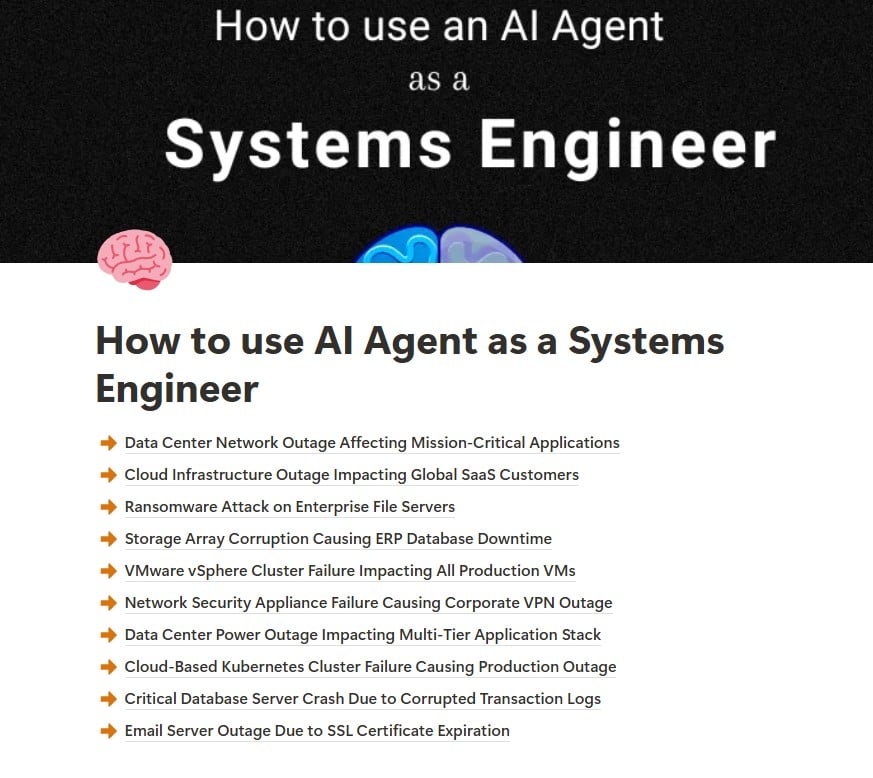 This guide shows systems engineers exactly how to deploy AI Agents (ChatGPT, Claude, Gemini, etc.) to solve critical infrastructure problems — with no fluff and no tech jargon. Just fully loaded, real-world systems engineering scenarios you actually handle — each broken down with: