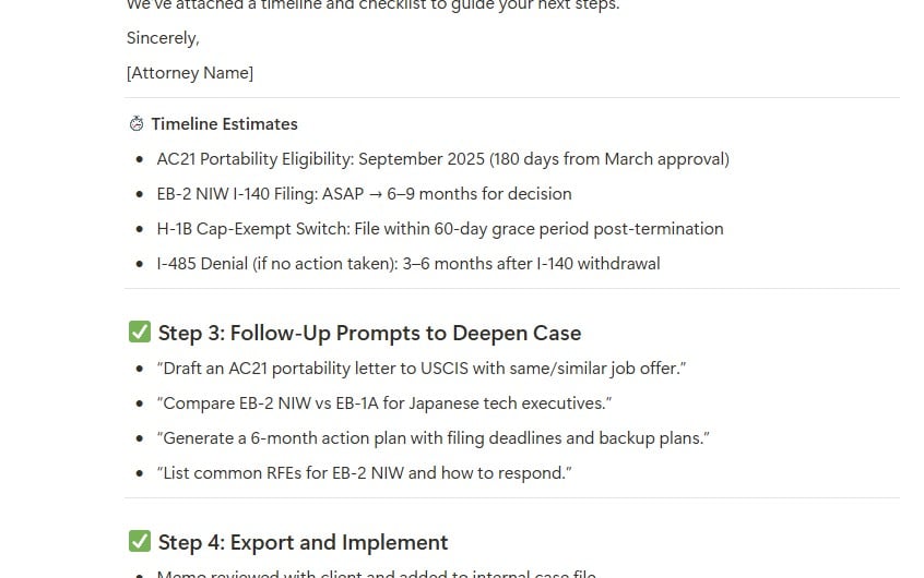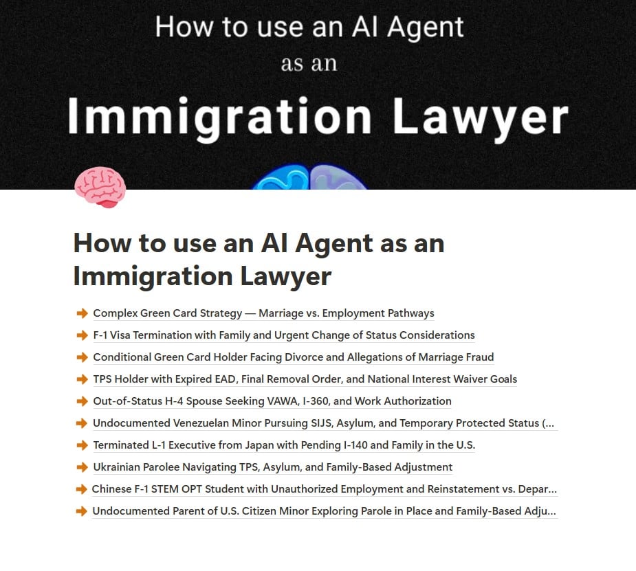 Includes a reusable AI Agent Mini Prompt Template you can adapt to any case — from marriage-based green cards to EB-2 NIW petitions and beyond.
