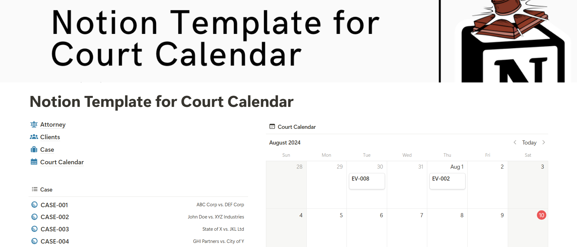 Effortlessly manage all your court dates and deadlines with our "Notion Template for Court Calendar." This powerful tool helps you stay organized, ensuring you never miss a critical appointment. Simplify your legal scheduling and keep your practice running smoothly.