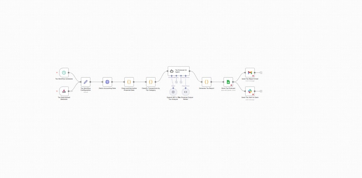 A powerful automation system built with n8n + AI that analyzes your financial data, applies tax logic, and predicts quarterly and annual tax liabilities before deadlines arrive.
